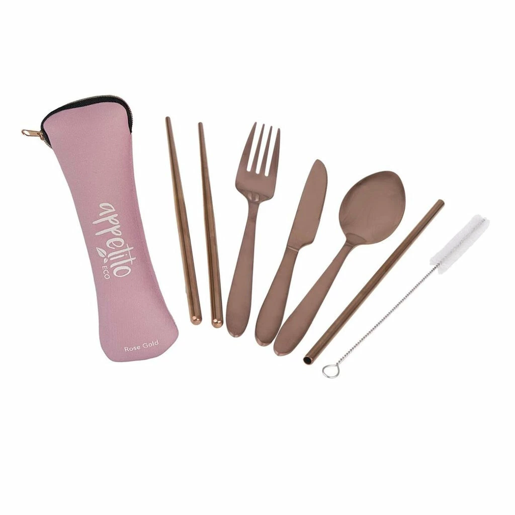 Suitable for school, work, picnics, camping trips or more, this reusable cutlery set by Appetito includes a knife, fork, spoon, set of chopsticks, drinking straw and cleaning brush €“ a versatile pack for everyday use. Crafted from quality stainless steel, they are securely stored in a neoprene travel pouch perfect to keep in your handbag, lunch bag or pouch.