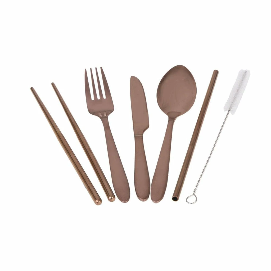 - Set includes chopsticks, fork, knife, spoon, straw & straw brush