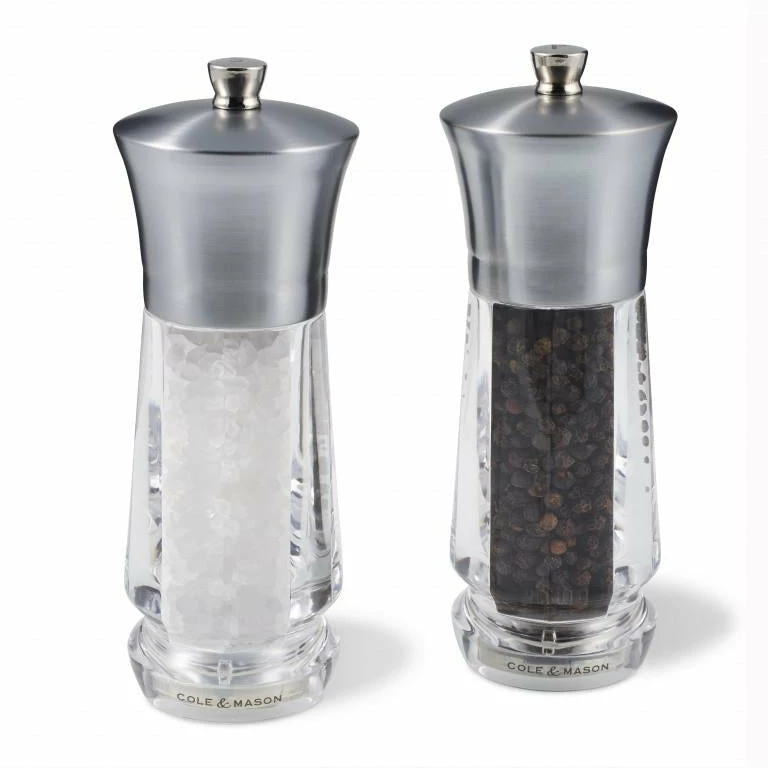 Grind your salt and pepper in style with the Cole & Mason Exford Nickel Gift Set. A simple yet stylish salt and pepper mill made from acrylic with a brushed nickel effect top, this handy kitchenware set instantly adds both style and functionality to any dining table.