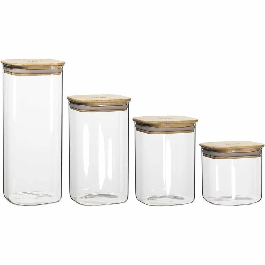 Keep your cupboard fresh and organised with the Ecology Pantry Square Canisters – Set of 4. Made from borosilicate glass the Pantry canisters from Ecology help you tidy up the pantry without adding unnecessary weight. These glass storage canisters have a square shape to optimise storage with modern rounded corners. The canisters feature bamboo lids with airtight seals.