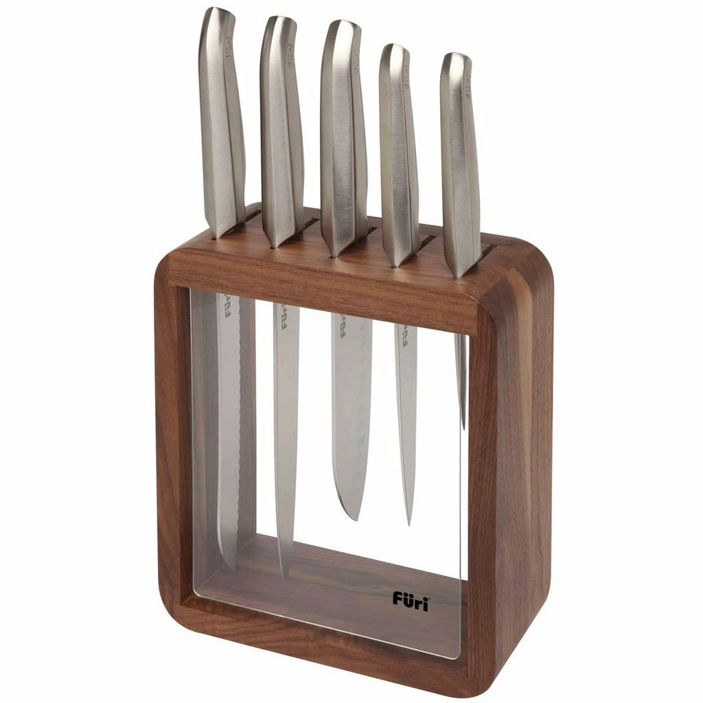 Complement your knife skills with the high-quality knives of the Furi Vault Knife Block 6 Piece Set. Featuring blades crafted from high quality, Japanese steel for superior durability and resistance to stain and corrosion, and a knife block made from black walnut wood with a transparent acrylic viewing panel to aid knife selection, this set is perfect for taking you from a cooking amateur to a MasterChef in the kitchen.