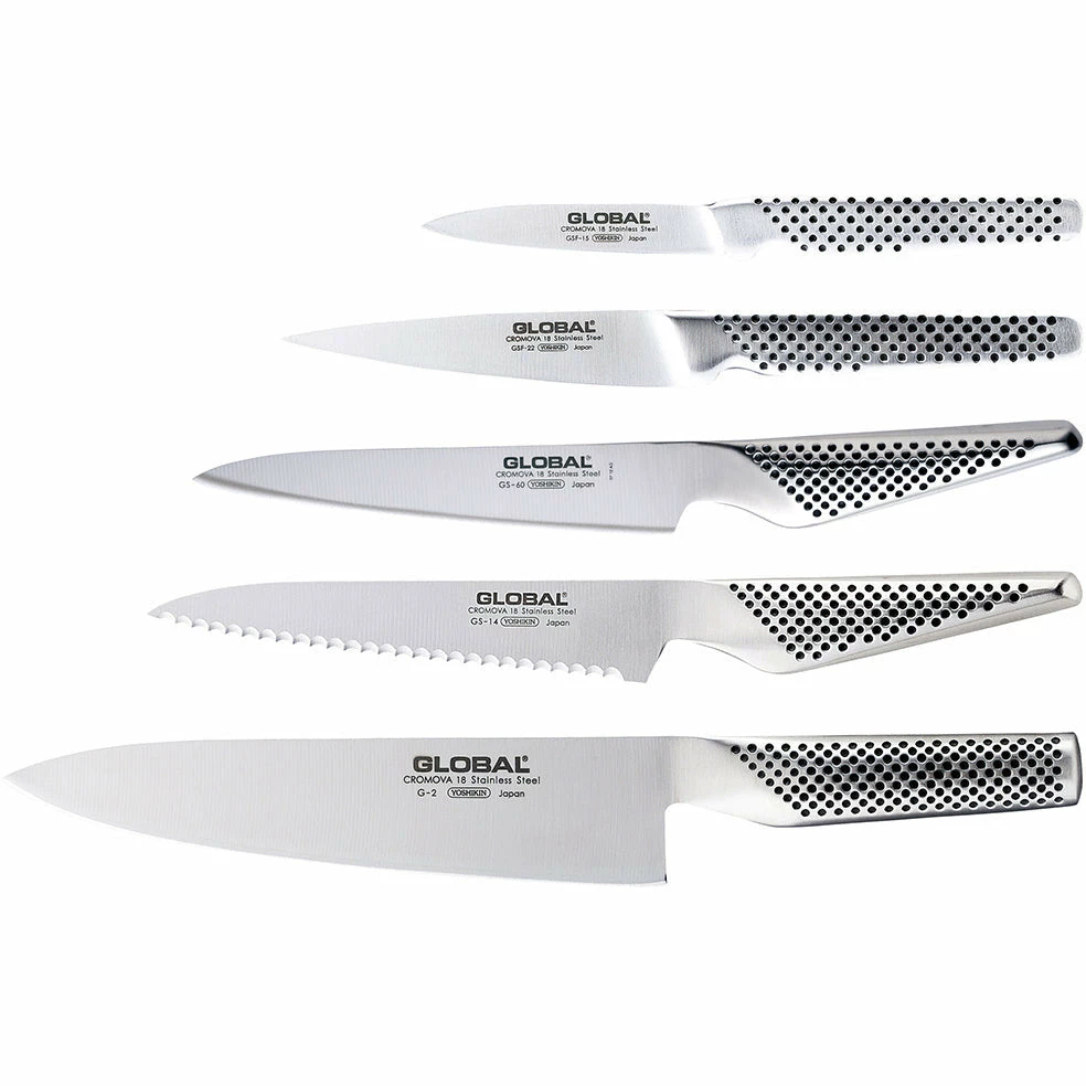 Named after the Japanese samurai sword, this Katana Global knife block houses 5 best-selling Global knives, each made of CROMOVA 18 stainless steel with a razor-sharp edge and corrosion-resistant quality. Showcased in an elegant walnut knife block, each knife in this Global knife set is weighted for optimal balance with smooth and seamless contours that prevent any food or dirt traps giving you ultimate safety and hygiene.