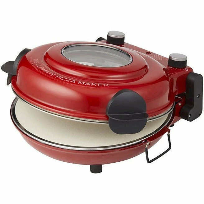 This easy to use, efficient pizza maker features a ceramic baking stone and adjustable thermostat, heat indicator, and timer that allows you to cook pizzas to perfection. Its heating elements can serve homemade pizzeria-style pizzas, all in a compact and space-saving oven!