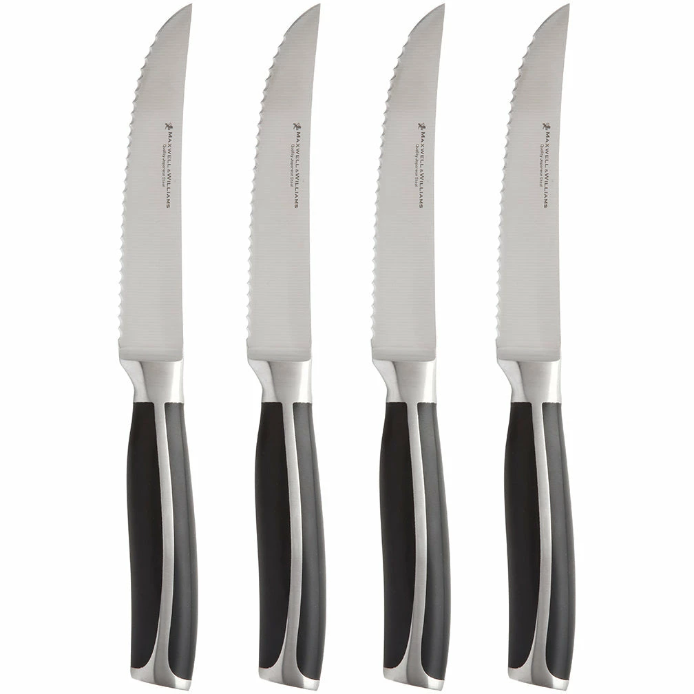 Stanton steak knives are designed with a serrated edge, helping you slice through tough meats without compromising quality. With a selection of handles to choose from €°ö_ÌÇ wooden, black, or stainless steel €°ö_ÌÇ every knife set showcases superior strength and durability with their Japanese stainless steel.