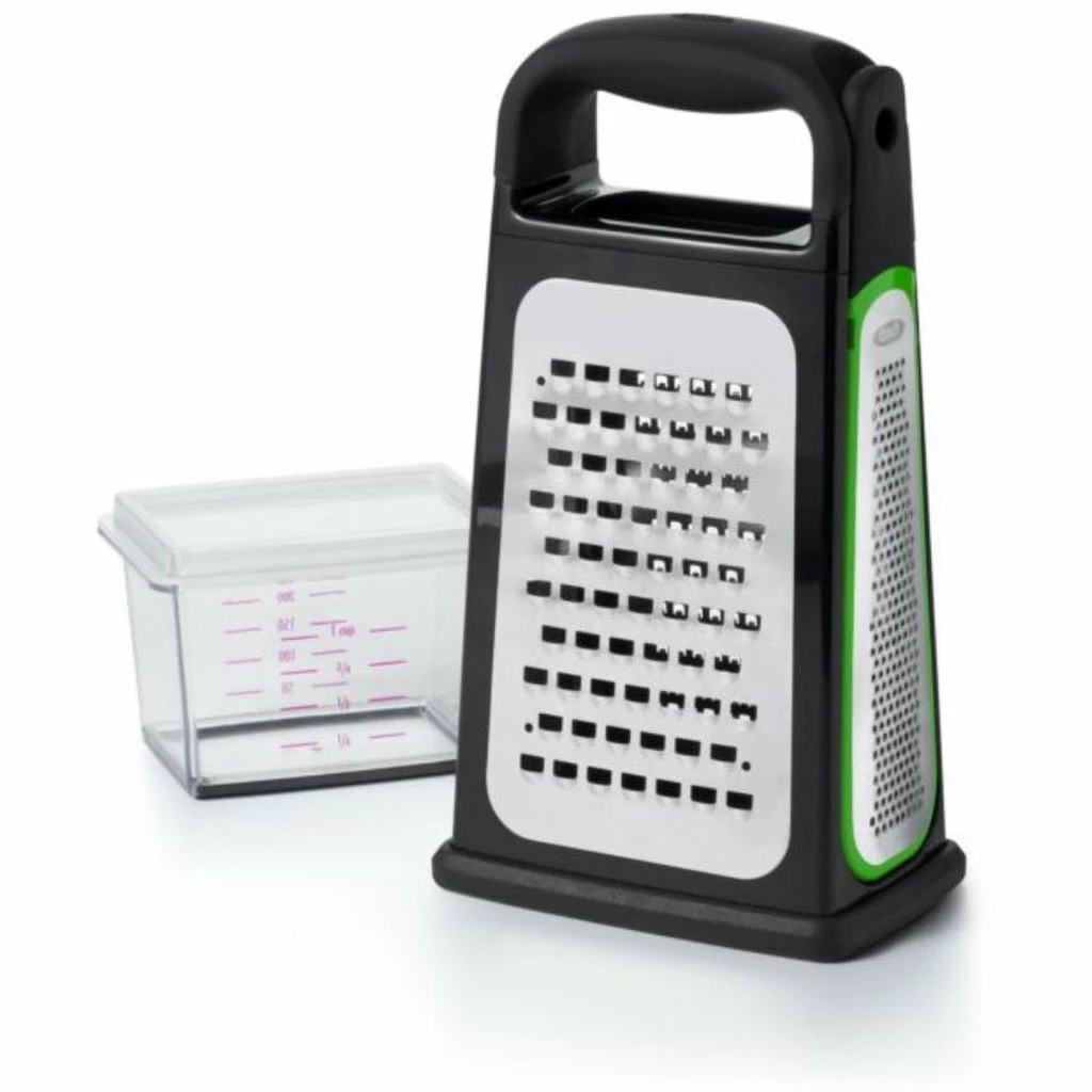 Who said cooking had to be hard? Prepare your veggies perfectly using the Oxo GG Boxed Grater w/ Removable Zester. Made with 4 different blades for 4 different slicing options, angled slicing, medium grating, coarse grating and a zester, this boxed grater features high-quality and durable stainless steel blades for ultimate longevity. With a non-slip foot that enables the grater to remain in place when in use, this handy kitchenware item has a convenient removable clear container that catches food as you grate it. 1% of Oxo’s annual sales go to helping environmental non-profits.