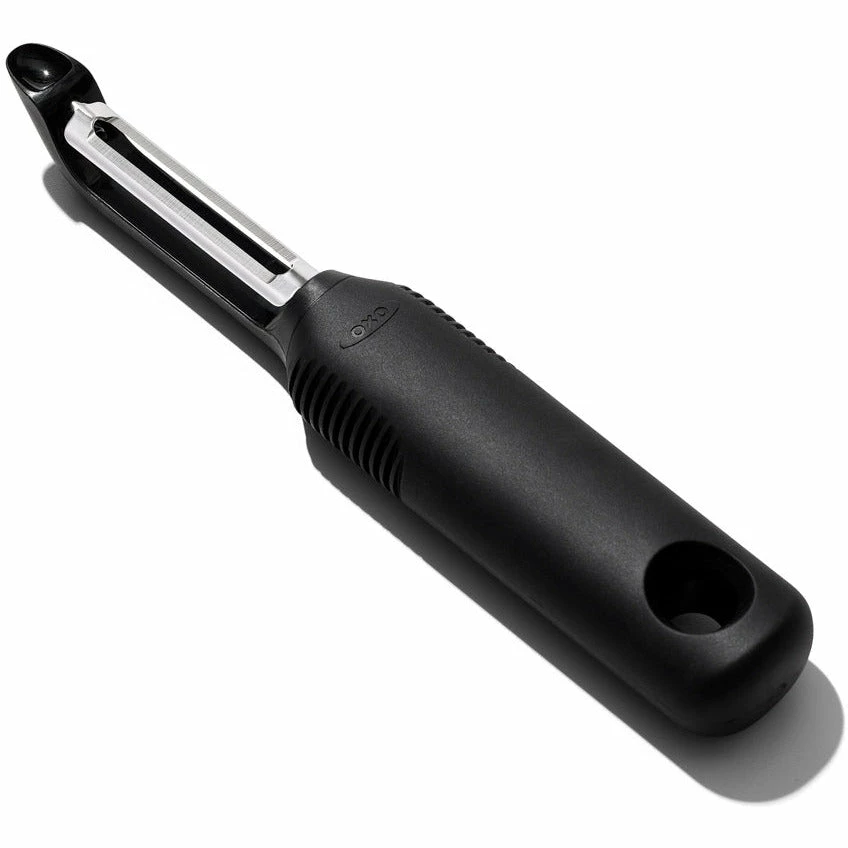 With the Oxo Swivel Peeler you can now peel your vegetables and fruits easily and efficiently. This handy kitchen accessory features a pivoting stainless steel blade and slip-proof Santoprene handle for razor-sharp peeling.