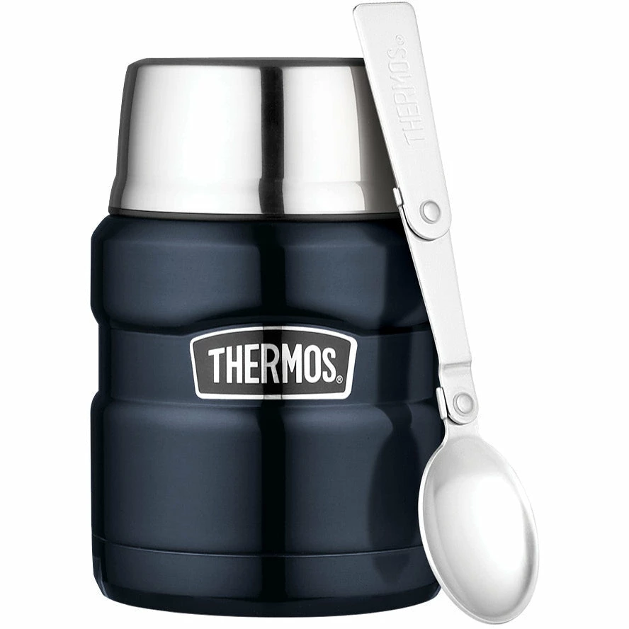 The Midnight Blue 470ml Thermos Stainless King Vacuum Insulated Food Jar will keep your hot food piping hot for up to 7 hours and cold foods cold for up to 9 hours. Made of unbreakable stainless steel, this twin walled food flask with its wide mouth, even has a full sized fold up spoon concealed in the lid, is easy to fill, to eat from and to clean by hand washing or in the dishwasher. Vacuum insulated and cool to the touch even when filled with extremely hot foods, the food jar is also sweat-proof when filled with icy cold drinks or foods.